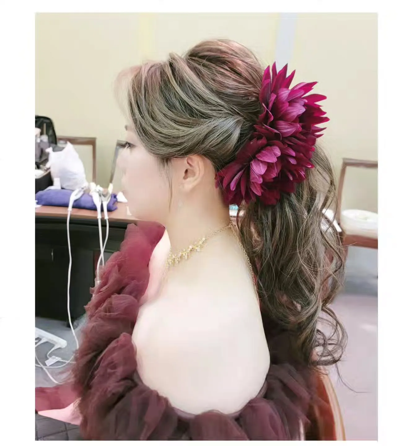 オフショルチュールのふわふわドレスと 2026/03/25 オフショルチュールのふわふわドレスと 大きな生花のダリアがインパクトあって可愛かったです🌼 #ブライダルヘアアレンジ #神戸ブライダルヘアメイク #神戸ブライダルエステ #ヘアメイク #ヘアアレンジ